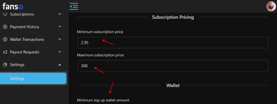 The feature allows the admin set minimum and maximum subscription prices for all the models from the general settings page in the admin backend. Models can also set minimum and maximum top-up amounts to their wallets which is as shown below.