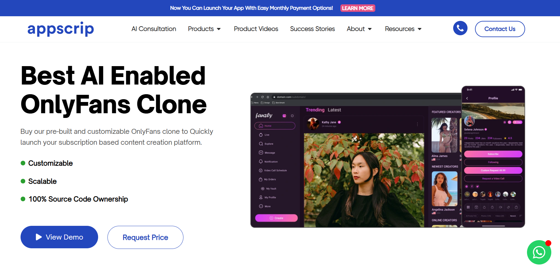 Appscrip is another leading OnlyFans clone script to launch your OnlyFans platform quickly. The pre-built script is crafted with creator-first features, such as custom requests, 1-on-1 video calls, social community, etc.