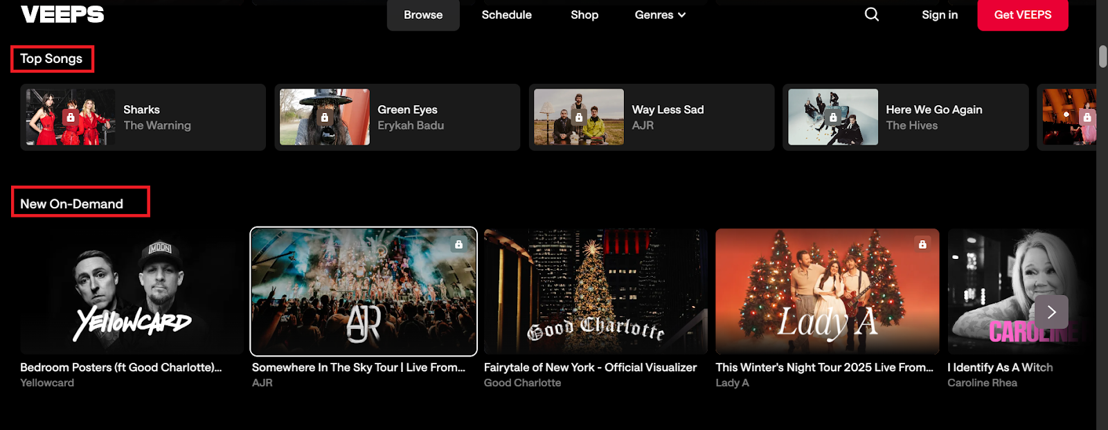 For example, Veeps website includes different categories such as “top songs”, “new on-demand”, “Top 10 in the US”, and “coming soon”.