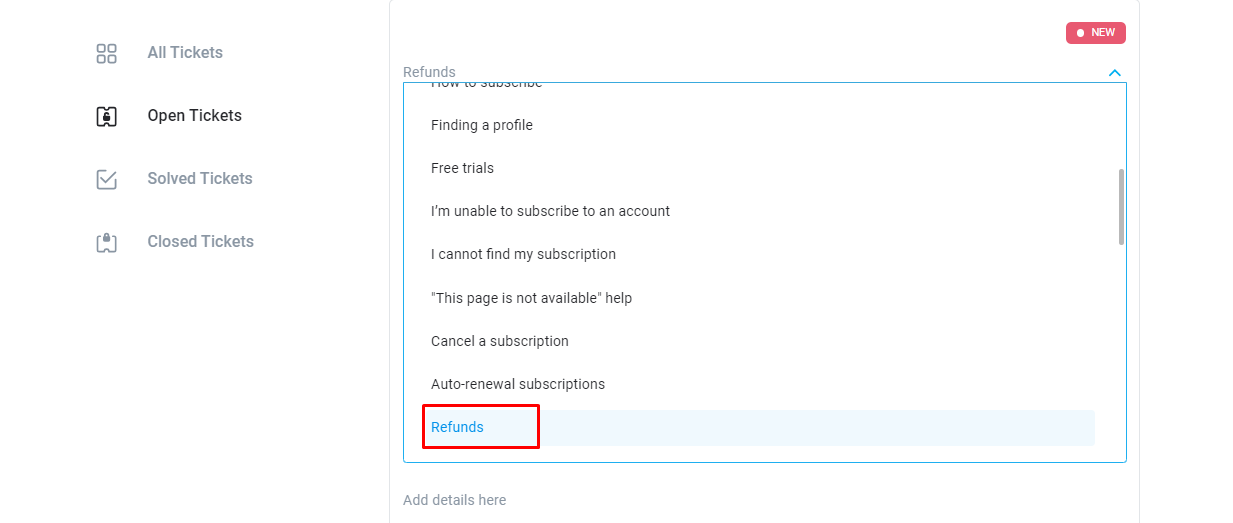 Next, click on the “Create a ticket” button. The following prompt opens where you are required to fill in the essential details. Select refunds in the question section. In the details section, attach a PNG or JPG file. This could preferably be a screenshot.