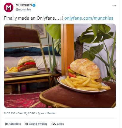 The next example is that of a major media publisher, Munchies, the online food channel owned by Vice Media. Munchies made it to OnlyFans and charged fans a monthly fee of $4.99 to access exclusive food-related videos.