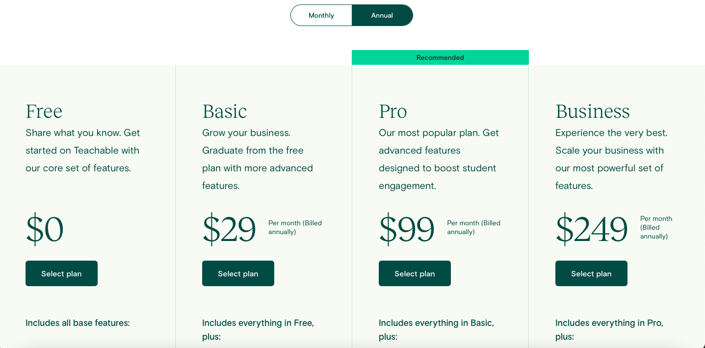 - Teachable provides multiple plans to pick from, including a free plan that has 1 admin and 10 students.