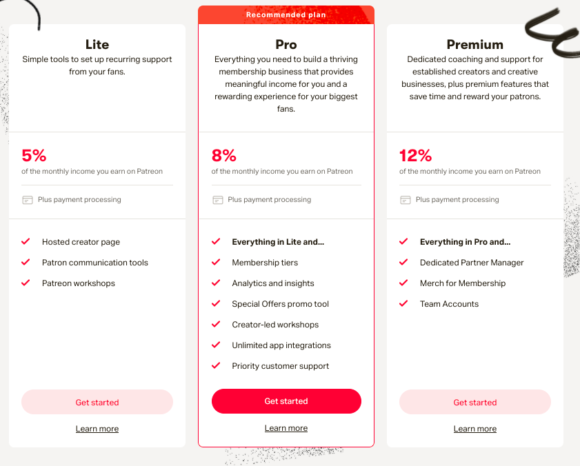 Patreon charges 5%, 8% & 12% and is based on which plan the creator chooses on the platform – Basic, Pro, and Premium.