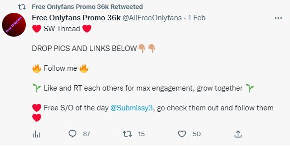 If how to promote OnlyFans on Twitter is your goal, the best way is to look for engagement groups. These are communities set up for OnlyFans creators to support each other. This is how an engagement group works: You like, retweet, and after engaging enough, you can receive attention from the community.