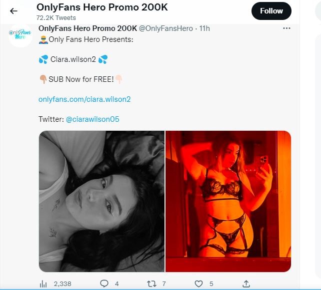 One of the most popular OnlyFans promotions on Twitter, having 30 million monthly impressions, is OnlyFans Hero. The page provides paid shoutouts for OnlyFans and other content creators.